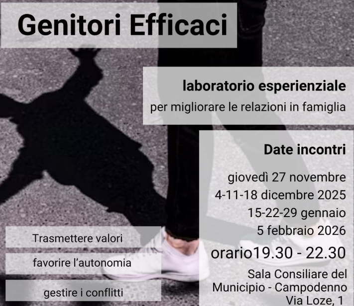 "Sono aperte le iscrizioni al percorso "Genitori efficaci" in partenza il 27 novembre 2025 a Campodenno.