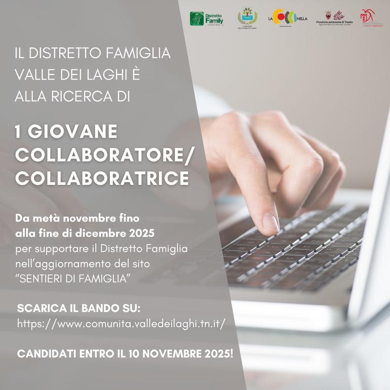 In collaborazione con la Cooperativa La Coccinella nell’ambito del progetto “Dialogando tra generazioni e territorio”, il Distretto famiglia ricerca un/una giovane del territorio dinamico/a e con spiccato interesse per la promozione locale per collaborare all'aggiornamento e alla valorizzazione online dei contenuti del progetto "Sentieri di famiglia" (sentieridifamiglia.com ).