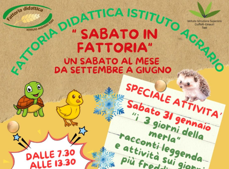 L'attività si terrà sabato 31 gennaio, dalle 7:30 alle 13:30 presso la Fattoria Didattica, Istituto Agrario di TodiBambini della scuola dell'infanzia e primaria. Un'occasione per scoprire la natura, gli animali e il mondo della fattoria in modo divertente e coinvolgente.