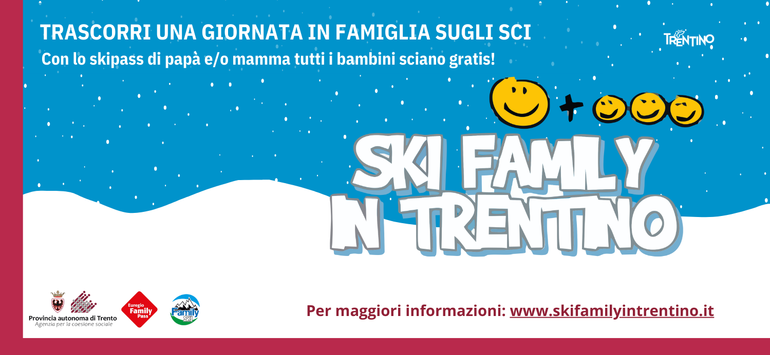 Ski Family è un’iniziativa per incentivare le famiglie a passare del tempo insieme sulle piste da sci! Il principio fondamentale è che genitore/i e figli passino insieme ai tornelli presentando lo skipass emesso appositamente, che quindi attiverà l’apertura 2, 3, 4 o 5 volte in base al numero di figli al seguito.
