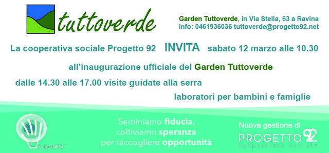 La cooperativa sociale Progetto 92 invita alla giornata di inaugurazione e apertura al pubblico del Garden Tuttoverde, nell’ambito di Jobs4NEET, iniziativa di inclusione sociale e lavorativa per giovani. Si terrà sabato 12 marzo alle 10,30 in Via Stella 63 a Ravina.